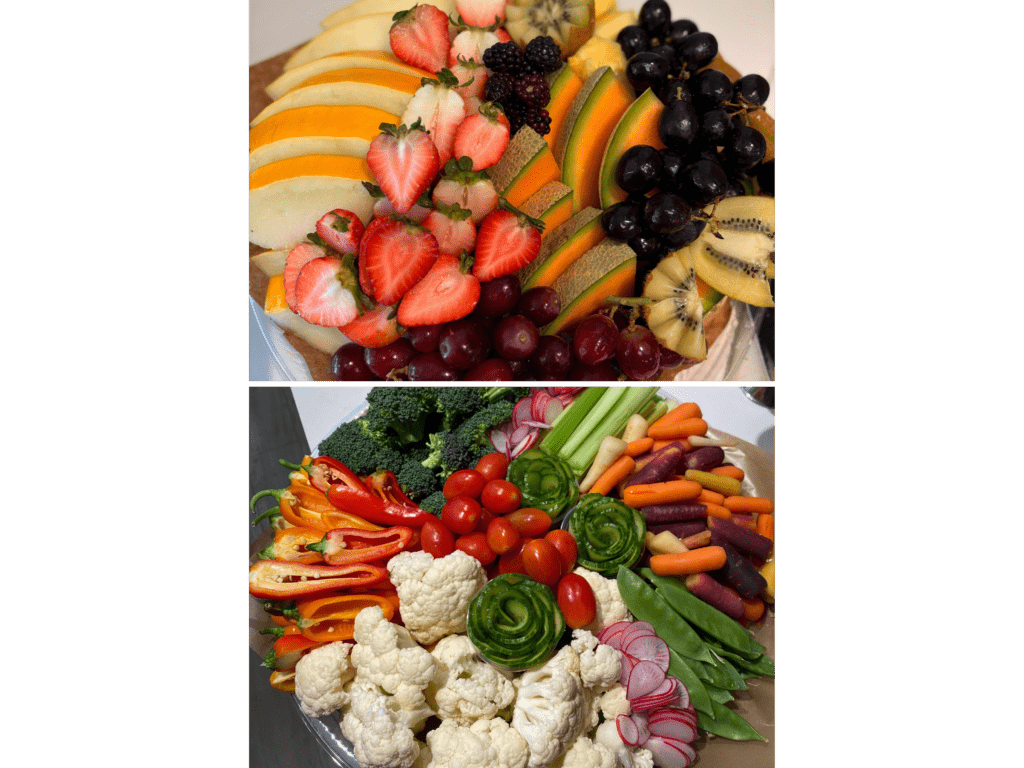 Strawberry cream included with fruits platter. Ranch & hummus included with Vegetables Platter
